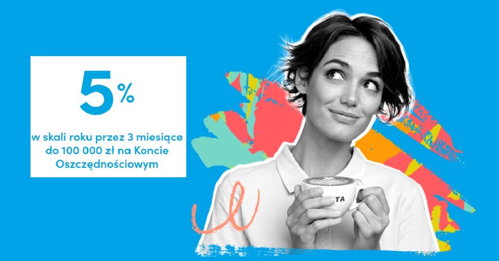 Przelej na Konto Oszczędnościowe dowolną kwotę do 100 000 zł. Promocyjne oprocentowanie 5% będzie naliczane przez 92 dni od dnia zawarcia umowy o to konto.