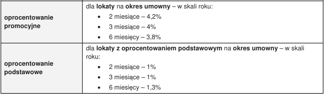 Wysokość oprocentowania Lokaty na Nowe Środki uzależniona jest wyłącznie od długości trwania lokaty. Dla lokaty na 2 miesiące przewidziane jest najwyższe oprocentowanie 4,2%, na 3 miesiące 4%, a dla lokaty półrocznej 3,8%.