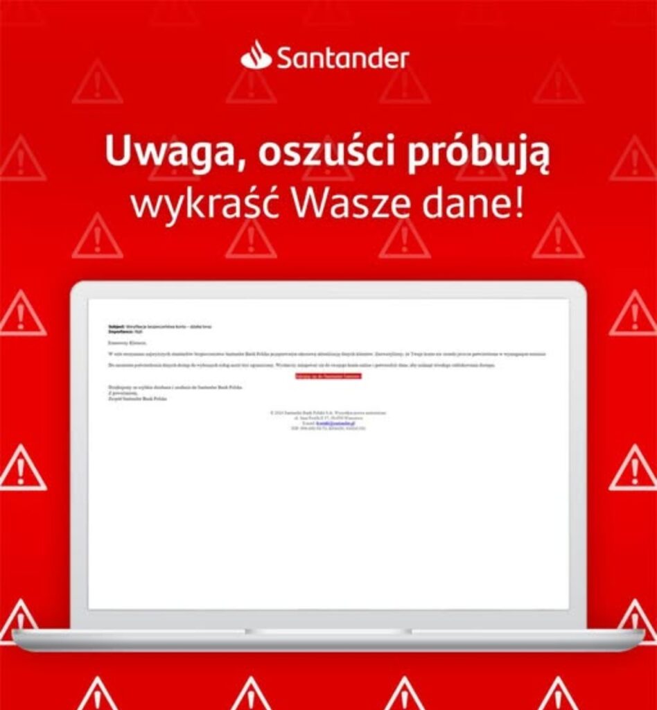 Ostatnie dni to okres zwiększonej aktywności cyberprzestępców. Widać to po częstotliwości, z jaką instytucje informują o ich kolejnych kampaniach. Zaledwie wczoraj na ZgarnijPremię opisywaliśmy ostrzeżenie, jakie w związku z działaniami oszustów wydała Poczta Polska. Na podobny krok zdecydował się Santander Bank Polska.