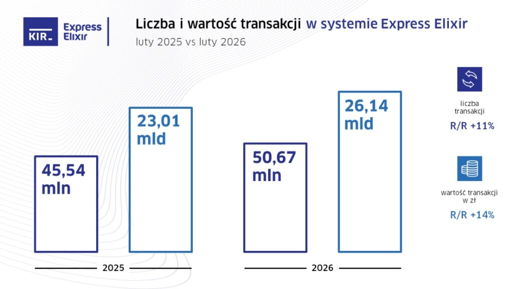 Krajowa Izba Rozliczeniowa przedstawiła statystyki transakcji, które w lutym 2026 roku przetworzyły jej systemy rozliczeniowe. W stosunku rocznym wzrosła ich ilość w systemie Express Elixir.