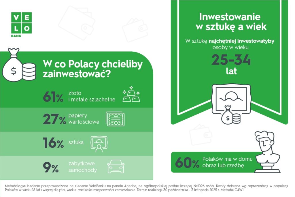 „Dzieła malarskie, rzeźby czy fotografie stanowią nie tylko ozdobę wnętrz domów czy biur, ale też potrafią zyskiwać na wartości szybciej niż tradycyjne aktywa. Coraz więcej kolekcjonerów traktuje zakup obrazu jako długoterminową strategię inwestycyjną, a nie wyłącznie zaspokojenie swoich artystycznych upodobań. Nadal jednak tego typu formy lokowania kapitału stanowią relatywnie niski udział w portfelach inwestycyjnych. Jedną z głównych barier dla takich przedsięwzięć pozostaje wysoka jednostkowa cena dzieł sztuki” – podkreśla Grzegorz Zawada, Dyrektor Biura Maklerskiego VeloBanku.
